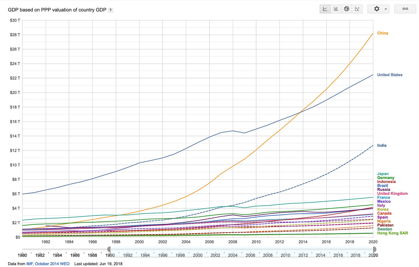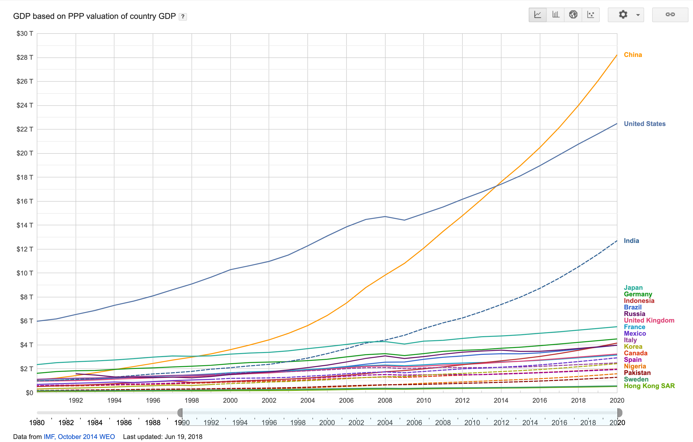 India to potentially become the world’s next manufacturing hub. Looking at GDP growth adjusted for PPP below, India’s definitely on the rise. They for sure won’t be taking pole position as the world’s next superpower, so what role will India play?